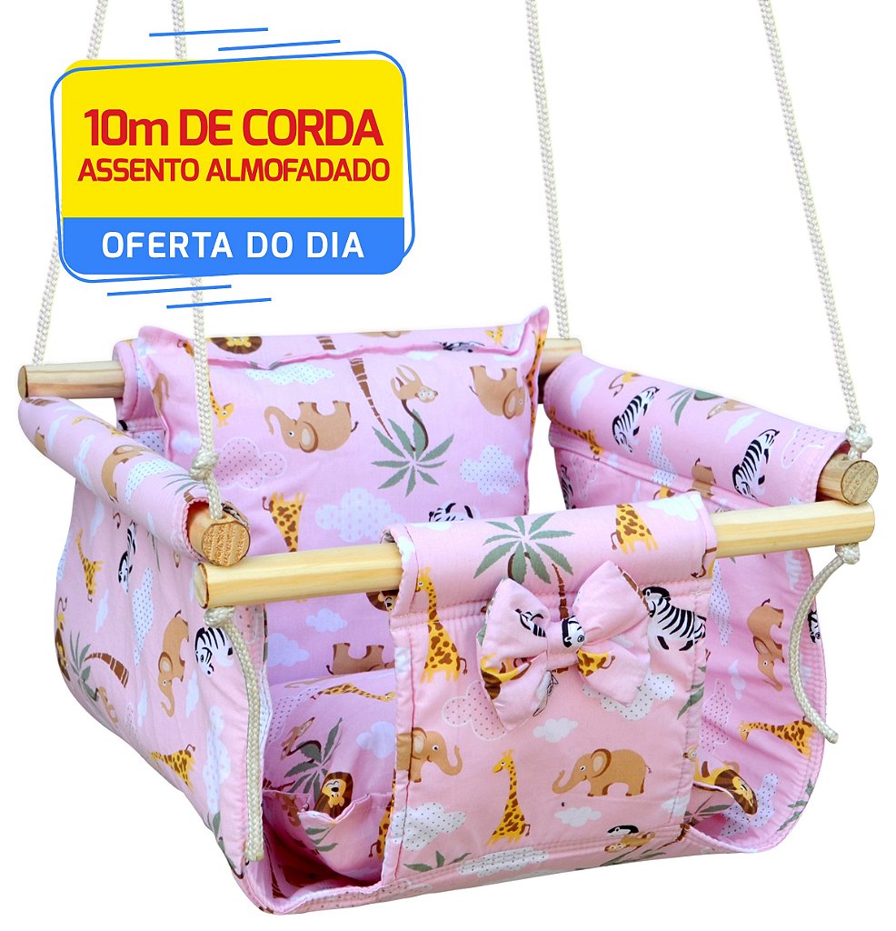 Balanço Infantil Tecido Madeira Corda Com Almofada Promoção - Rosa Zoo